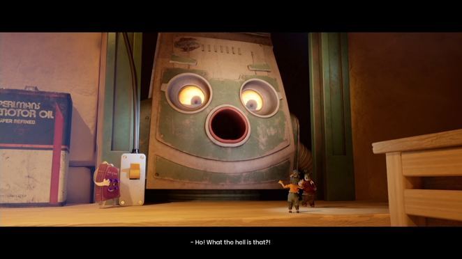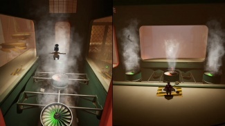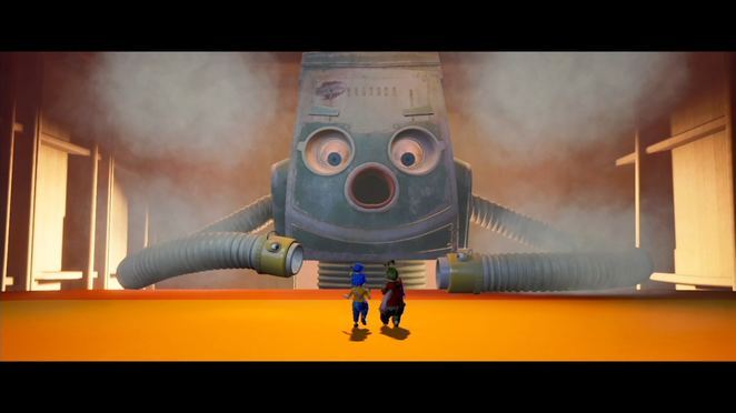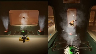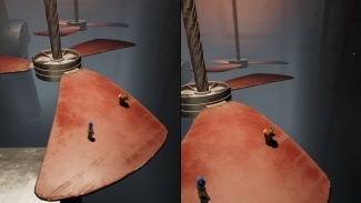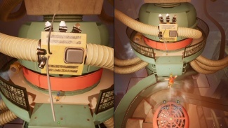 플랫폼을 건너면 교류가 있는 3개의 팬을 통과해야 합니다. 한 플레이어는 유리창 외부의 레버를 제어하여 팬의 방향을 제어하고 다른 플레이어는 반대편에 도달할 때까지 기류를 타게 됩니다. 기류를 타는 플레이어는 레버 조작자가 기류를 전환하는 적절한 순간에 점프해야 하기 때문에 여기에서 커뮤니케이션이 중요합니다. 첫 번째 플레이어가 반대편에 도달한 후 이번에는 다른 플레이어/이전 레버 조작자에 대해 프로세스를 반복해야 합니다. 두 플레이어가 다시 모인 후 두 개의 노란색 떠 있는 룸바를 타고 다음 기계 안으로 향합니다.