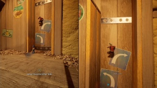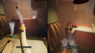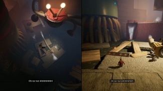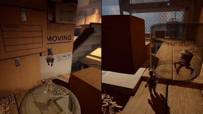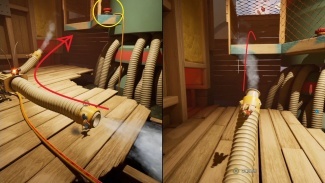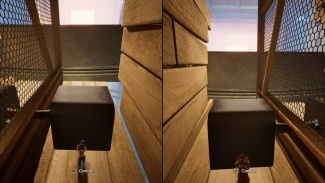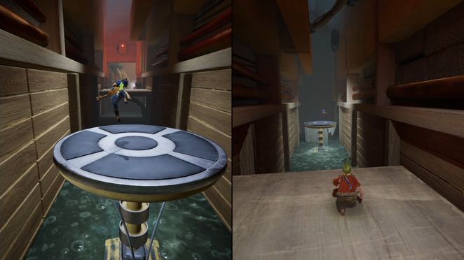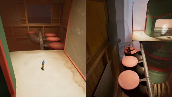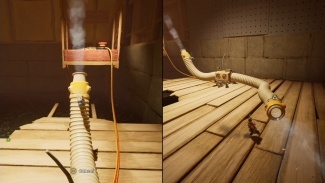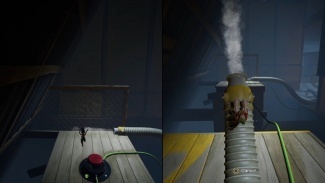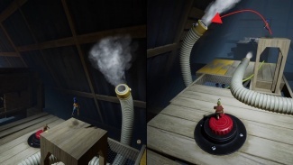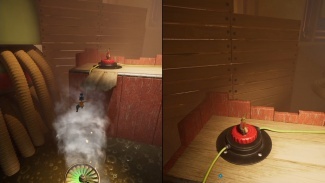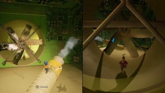 두 플레이어 모두 해당 깔때기를 통해 입력해야 합니다. 공중으로 던질 때 착륙을 제어하고 다른 깔때기에 착지해야 합니다. 마침내 큰 배기 팬에 도달할 때까지 이 작업을 계속하십시오. 한 플레이어는 근처의 손잡이를 잡고 블록을 왼쪽으로 밀어 구멍을 만들어 파트너가 다른 퍼즐이 기다리고 있는 내부를 통과할 수 있도록 합니다.
