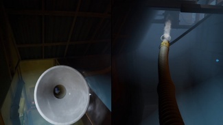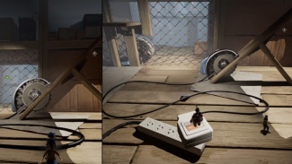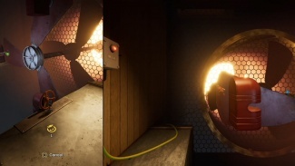 퍼즐을 풀려면 두 플레이어가 모두 필요합니다. 실내에 있는 플레이어는 진공관을 타고 팬 블레이드에서 멀어지는 방향으로 기류를 조정해야 합니다. 이렇게 하면 다른 플레이어가 안으로 들어갈 수 있습니다. 다음으로, 신체를 사용하여 절단된 전선을 통해 전류를 보내야 합니다. 한 플레이어(P1)가 첫 번째 절단 와이어의 양 끝을 잡고 다른 플레이어(P2)가 버튼을 누릅니다. 전류가 천천히 흐르면서 P2는 다음 간격으로 이동하고 다시 양쪽 끝을 잡고 있어야 합니다. 그런 다음 P1은 다른 간격으로 이동하여 회로를 완성하고 근처의 진공관을 낮춥니다.
