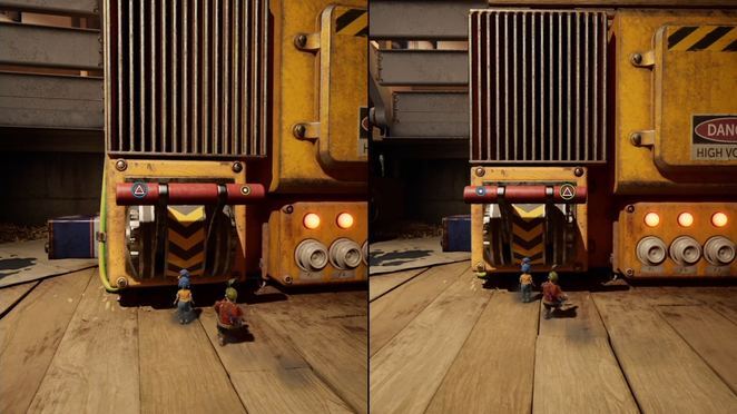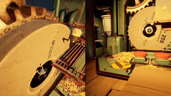 터널로 가서 웅크리고 웅크려 터널을 가로질러 기어갈 수 있고 접근 가능한 두 개의 빨간색 버튼이 있는 분쇄기에 도달할 때까지 계속 길을 따라가십시오. 두 선수는 그라인더의 전원을 켜기 위해 동시에 점프하고 버튼을 두드려야 합니다. 이제 회전하는 기어 표면에서 점프한 다음 플랫폼에서 오른쪽으로 점프해야 합니다.