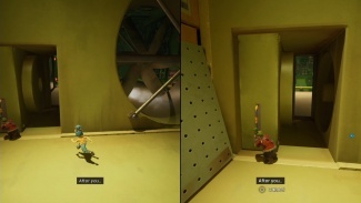 플레이어 중 한 명이 배출구 노즐을 타고 버튼이 있는 선반 쪽으로 위쪽을 가리켜야 합니다. 그 플레이어는 파트너가 선반에 도달할 수 있도록 노즐의 위치를 잡아야 합니다. 다른 플레이어는 입구를 통과하여 선반에 착지해야 합니다. 거기에서 빨간색 버튼을 점프하고 두드려서 아래 팬의 기류 방향을 반대로 바꿉니다. 뒤에 남은 플레이어는 같은 난간에 도달하기 위해 공중을 타야 합니다. 두 플레이어는 다른 복도로 이어지는 다른 진공관으로 빨려 들어가야 합니다.