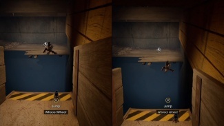 퓨즈가 탈출하므로 정상에 도달할 때까지 좌우로 연속 벽 점프를 수행하여 따라가십시오. 퓨즈를 계속 따라가다가 톱, 도구 상자 및 해치에서 두 번 점프합니다. 나중에 파트너와 함께 해치를 당겨 엽니다.