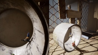 일정한 간격으로 회전하면서 잡고 미끄러질 수 있는 표면이 보일 때까지 경로를 따르십시오. 점프하여 그것에 집착하고 다음 플랫폼으로 점프하십시오. 이 플랫폼에는 테이블 톱이 있으므로 착륙에 주의하십시오. 두 간격을 가로질러 만들려면 이중 점프 + 대시 콤보를 수행해야 합니다. 철조망에 도달한 후 페인트 통 안으로 들어가 햄스터 바퀴처럼 달리면서 오른쪽으로 돌립니다. 깡통을 입구 앞에 놓으면 깡통을 타고 울타리를 지나갈 수 있습니다.