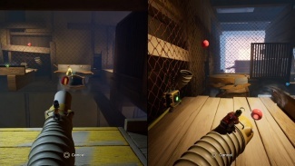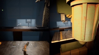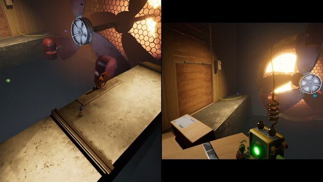 P2는 큰 해치를 지나 선반의 다른 쪽 끝에 있는 상자 더미 위에 전원 버튼을 찾습니다. 버튼을 눌러 팬의 전원을 켜고 해치를 엽니다. 팬이 회전하여 P1이 평평한 표면을 잡고 P2와 다시 그룹화할 수 있습니다.