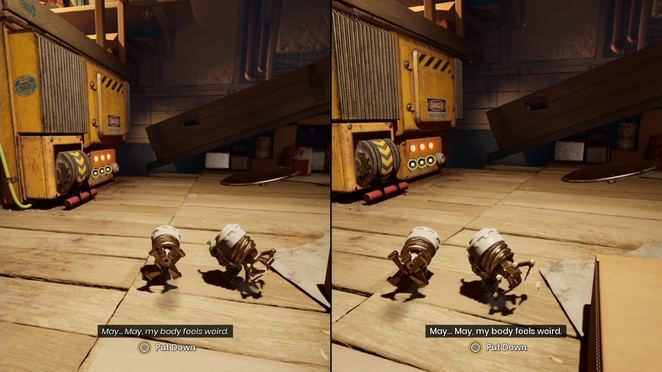 시작 지점에서 떠 있는 나무 판자에 도달할 때까지 튜브를 따라가십시오. 검은 액체에 빠지면 즉사하므로 판자 위로 점프하여 액체를 조심스럽게 건너십시오. 오르막길을 계속하다가 의도적으로 진공관 속으로 빨려들어갑니다. 공중에 띄운 후 넘어지면서 캐릭터를 조종하세요. 액체에 직접 발사될 것이기 때문에 주입구에 떨어지지 않도록 하십시오. 이 환경 퍼즐을 풀기 위해 파트너가 착륙할 때까지 기다리세요.