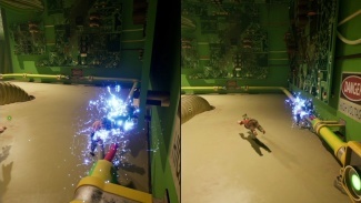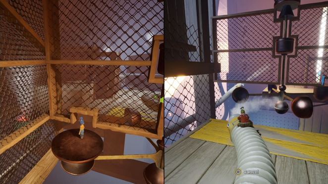 거기에서 벽 점프를 통해 위층에 도달한 다음 다른 진공관이 있는 와이어 케이지에 도달할 때까지 경로를 따라 계속 진행합니다. 이전과 마찬가지로 한 플레이어가 타고 빨간색 버튼으로 돌출부를 향해 출력 노즐을 조준한 다음 다른 플레이어는 안으로 빨려들어가 해당 돌출부를 향해 발사됩니다. 빨간색 버튼을 두드려 기류를 역전시킨 다음 다른 플레이어는 기류를 타고 위로 올라가 재편성합니다.