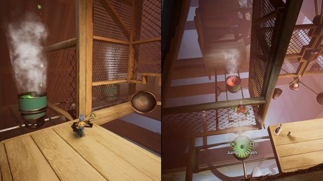 다음 지역에서 P2는 진공 배출구를 타고 떠다니는 룸바의 주머니를 조준해야 합니다. P1은 진공 흡입구를 타고 빨간 구슬을 빨아들여 주머니에 넣어야 합니다. 그러면 룸바가 더 무거워지고 P1의 점프 플랫폼으로 사용할 수 있을 정도로 낮아집니다. 두 플레이어는 각자의 경로를 따라 계속 진행한 다음 덤벨을 반대쪽 끝까지 밀어 보스 지역에 도달해야 합니다.