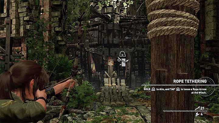 돛의 왼쪽에 있는 로프 코일에 도달하고 거기에서 로프 화살표로 레버를 쏘십시오(그림 1). 이 두 가지 작업을 결합하면 레버를 올바른 위치에 고정할 수 있고 통로가 영구적으로 열립니다(그림 2).