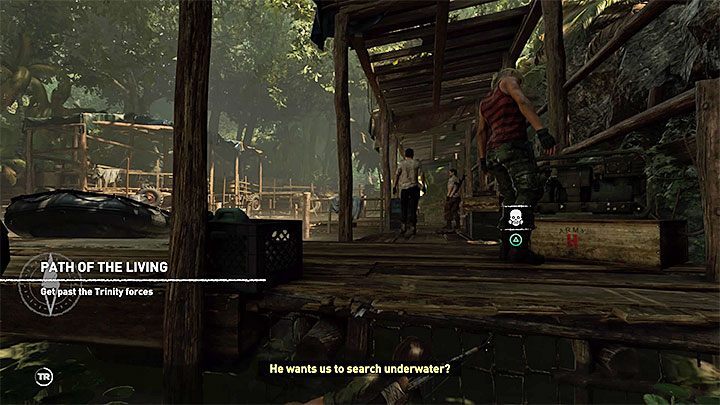 큰 건물을 나와 멀리 사원이 어렴풋이 보이면 물 속으로 뛰어듭니다. Lara는 부두에 있는 Trinity 전초 기지에 가까워지지만 도달하기 전에 잠수하여 손상된 판자 사이로 몸을 움츠려야 합니다.