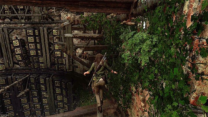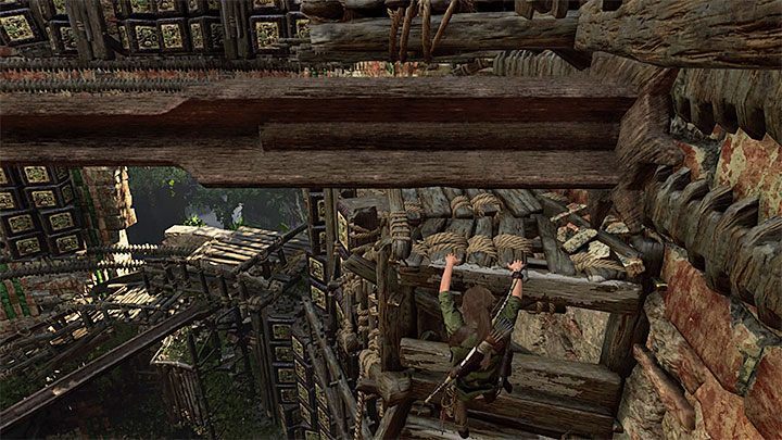 빔을 타고 올라가지만 메커니즘을 조심하십시오. 직접적인 접촉은 Lara를 죽일 수 있으므로 피하십시오. 위 그림에 표시된 타워 벽의 회전하는 구조물에 도달해야 합니다. 올라갈 수 있는 위치에서 멈출 때까지 기다렸다가 빠르게 진행하십시오.