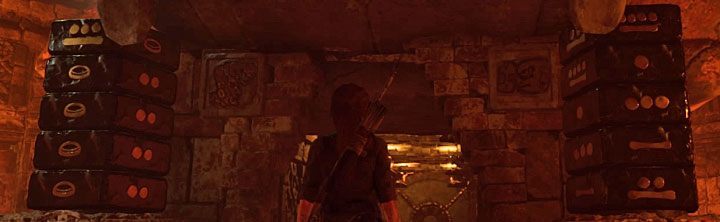 방의 위쪽으로 돌아가서 로프가 달린 새 레버를 찾으십시오(위 그림). 밧줄로 화살을 쏘십시오. Lara가 레버를 당길 것입니다. 이로 인해 가연성 물질이 쏟아지기 시작합니다. 두 번째 바리케이드 근처의 탱크를 채워야 합니다(홈이 올바르게 정렬된 경우).