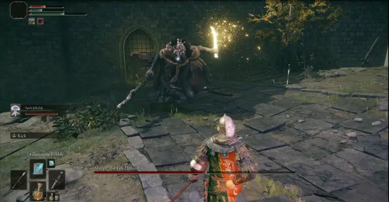 Margit이 막대기를 머리 위로 들어올려 꽤 오랫동안 유지하기 때문에 이 공격이 오고 있음을 알 수 있습니다. 당신이 이미 그를 공격할 수 있는 범위 안에 있다면, 그는 여기서 잠시 동안 취약합니다. 비록 그것을 완전한 개방이라고 부르지는 않겠지만요.
