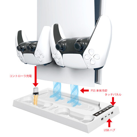 본 제품은 PS5 본체를 세로 놓을 때 활약하는 스탠드. PS5와 접하는 부분에는 쿨링 팬을 갖추고 있으며, DualSense 2대를 동시 충전할 수 있는 개를 탑재. 또한 USB-A 출력 포트와 Type-C 출력 포트를 각각 2기씩 갖추고 있다.
