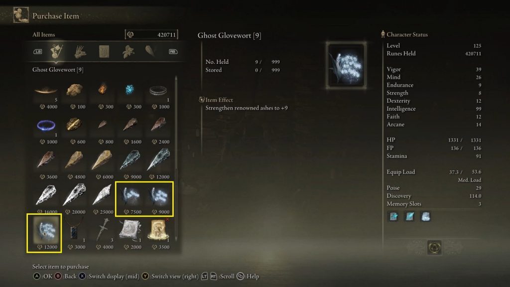 Ghost Glovewort Picker's Bell Bearing [3] 이 있으면 원탁의 요새로 이동하여 Twin Maiden Husks 에게 줍니다. 이제 Ghost Glovewort 7, 8, 9를 일정 비용으로 무제한 구매할 수 있습니다. 유령 장갑 [7]: 7500 룬 유령 장갑 [8]: 9000 룬 유령 장갑 [9]: 12000 룬