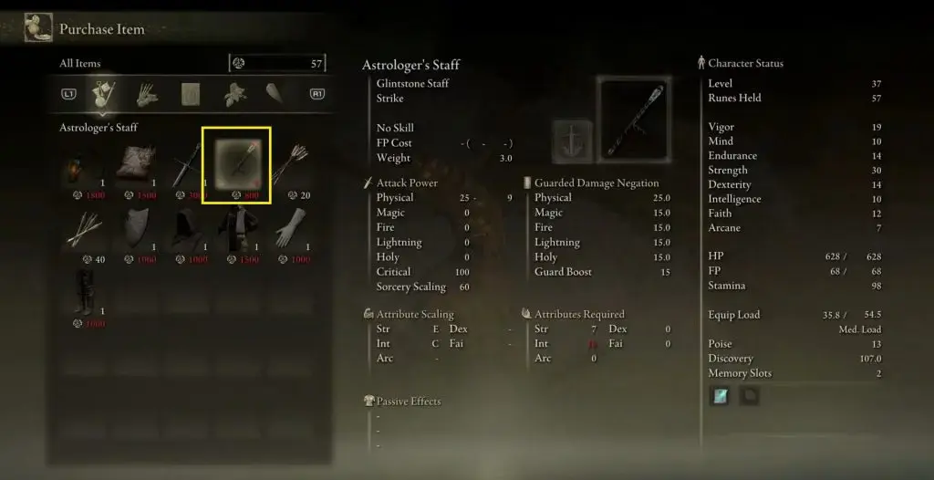 마법에는 지능 속성이 필요합니다. 먼저, 마법 주문을 찾아야 합니다. 일단 마법 주문을 발견하면 은혜의 자리에서 암기해야 합니다. 마법 주문을 시전할 수 있는 장비를 갖춘 지팡이가 있어야 합니다. Astrologer & Prisoner 클래스는 스타터 주문과 스태프와 함께 제공됩니다. 아래에서는 마법 주문 상인의 위치와 당신이 마법 주문을 사용하는 데 도움이 될 게임 초반 스태프의 위치를 보여 드리겠습니다.