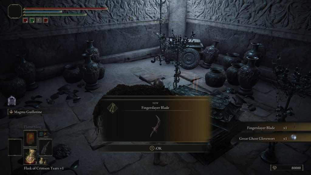 계단을 내려온 후 우회전하여 계속 북쪽으로 이동합니다. 길 끝에 있는 계단을 올라갑니다. 앞에 있는 건물로 들어가 상자를 열면 아래 사진과 같이 보물인 Fingerslayer Blade 를 얻을 수 있습니다.
