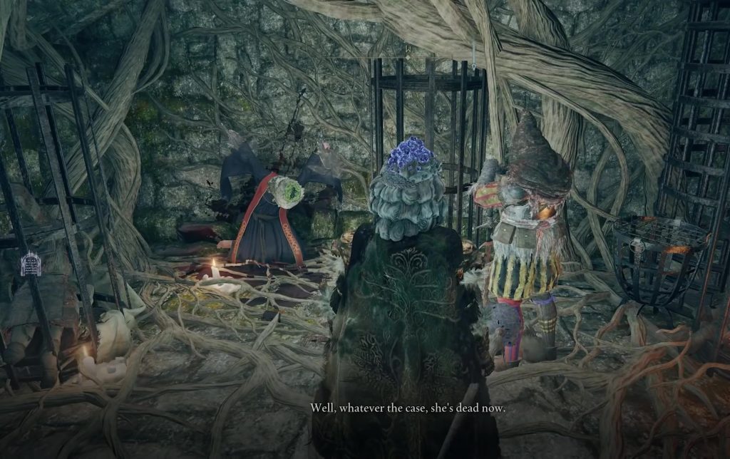 빨간색 표시를 선택하면 Sellen을 죽여야합니다. 이것은 당신에게 Sellen's Bell Bearing 과 Witch's Glintstone Crown 을 줄 것 입니다. 전투 후 Jerren에게 말을 걸면 고대 드래곤 대장장이 돌 을 줍니다.
