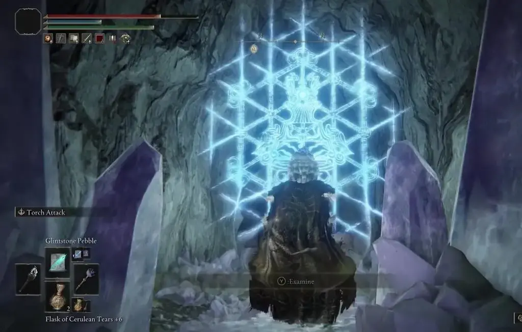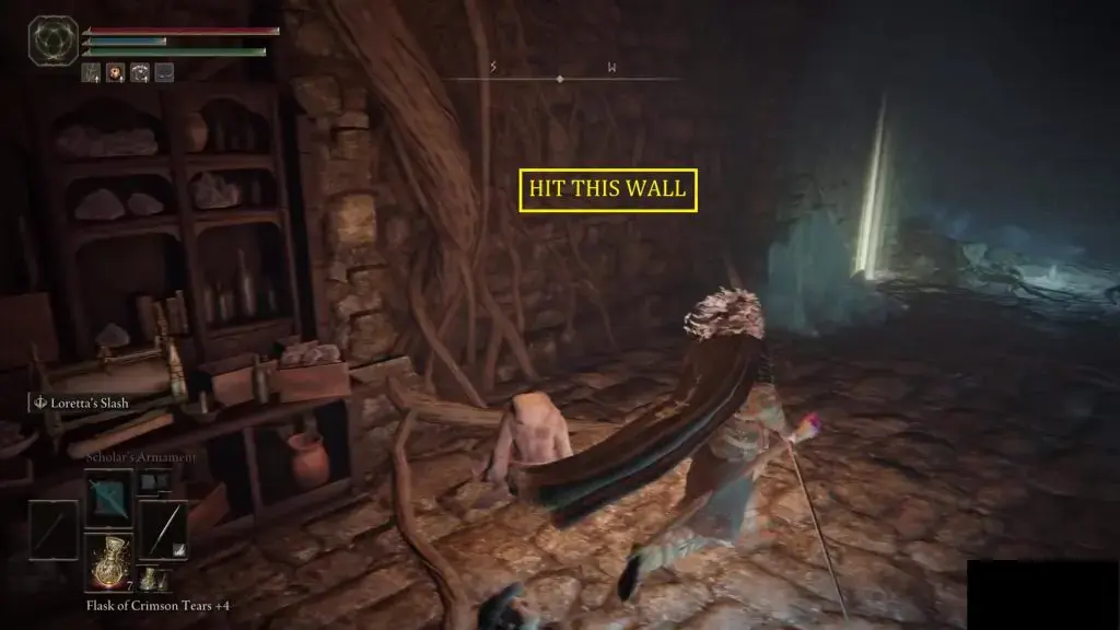 계단을 내려가 방의 반대쪽 끝에 있는 벽으로 가십시오. 이 벽도 환상입니다. 벽을 치면 숨겨진 방이 나타납니다. 여기에서 또 다른 Sellen을 찾을 수 있습니다. 그녀에게 Glintstone을 주십시오.