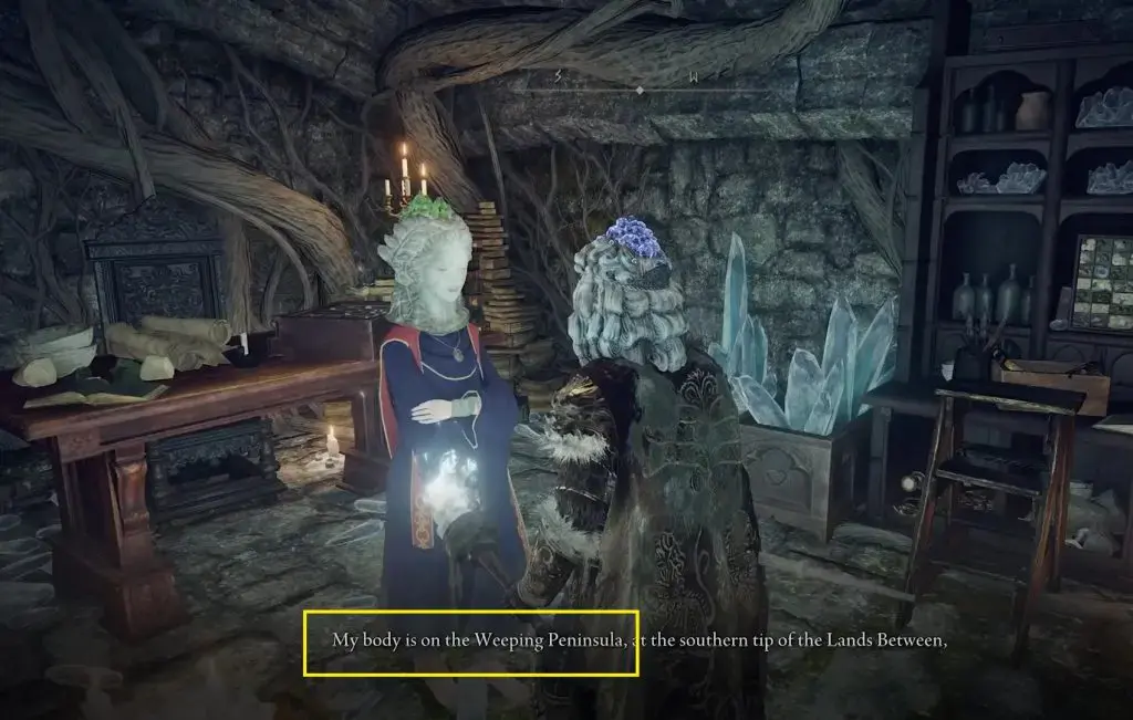 시체는 아래 사진과 같이 우는 반도 의 제4마리카 교단 남쪽에 있는 마녀파멸 폐허 에 있다. 당신은 폐허의 지하실에서 그녀를 찾을 수 있습니다. 그녀에게 말을 걸면 셀렌의 원시 반짝임 을 줍니다 . 어떤 이유로 그녀가 당신에게 등을 돌렸다면, 당신은 그녀와 대화하고 Liurnia의 교회에서 기도함으로써 그녀를 정상으로 회복 시킬 수 있습니다 .