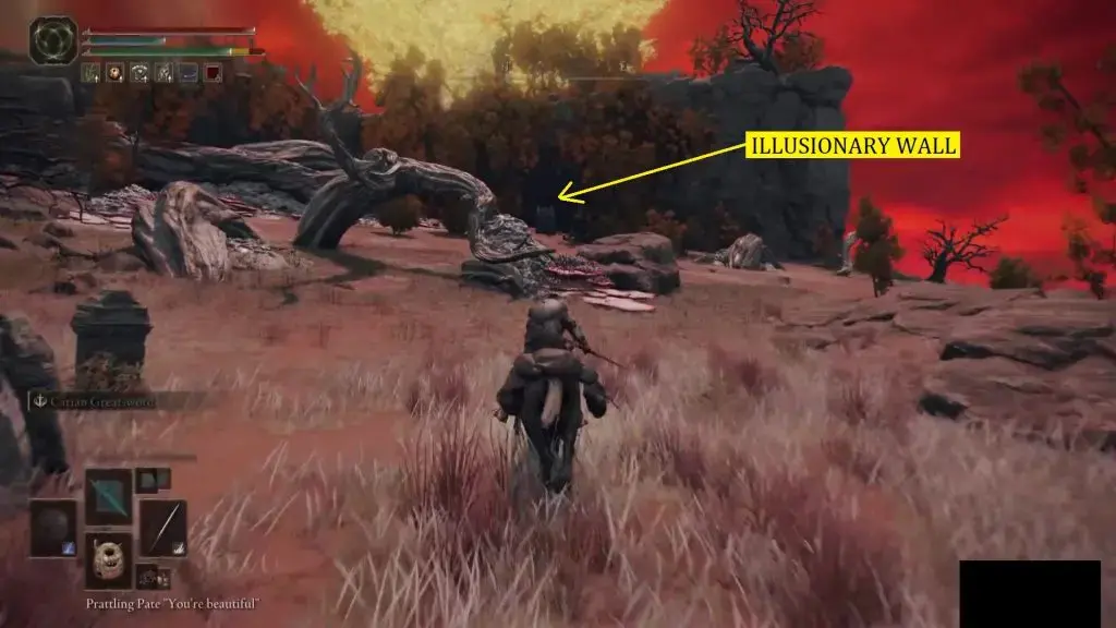 Master Lusat 에 도달하려면 아래와 같이 Caelem 에서 Fort Faroth 까지 동쪽으로 이동 하십시오. Fort Faroth 에서 남쪽으로 산을 내려갑니다. 여기에서 아래 사진과 같이 묘지 뒤 산에 환상의 벽을 발견할 수 있습니다. 환상의 벽을 치면 동굴이 드러납니다.