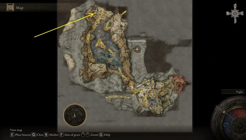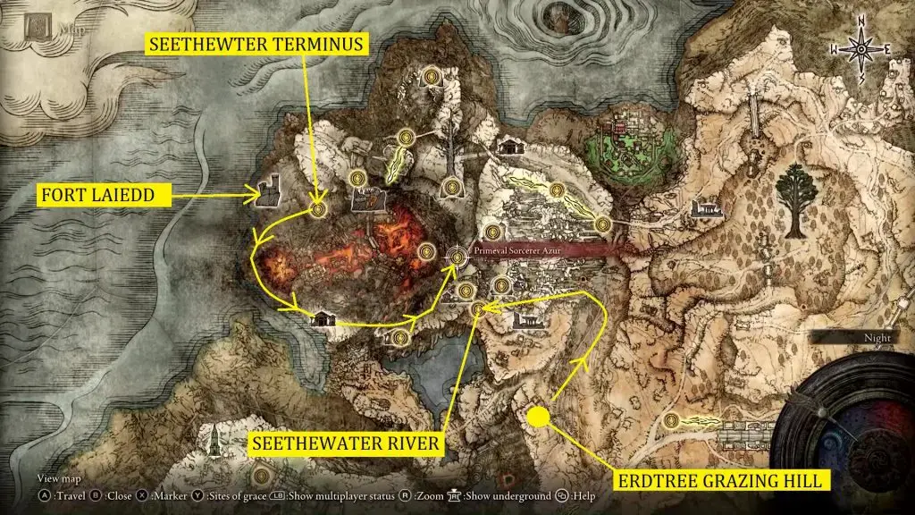 많은 플레이어들이 아주르를 찾기가 어렵다고 하니 찾아가는 길을 설명해 드리겠습니다. Dectus 의 그랜드 리프트를 사용하여 Altus Plateau 로 들어갑니다 . 거기에서 북쪽으로 이동하면 아래와 같이 은총의 Erdtree Grazing Hill Site of Grace에 도달합니다. 그곳에서 북동쪽 방향으로 오르막길을 오른다. 그런 다음 서쪽으로 이동하여 아래에 표시된 Seewater River Site of Grace에 도달합니다. 거기에서 강을 따라 가면 Seethwater Terminus Site of Grace에 도달합니다. 그런 다음 Fort Laiedd 방향으로 서쪽으로 이동 한 다음 남쪽으로 이동하여 용암 지대에 도달합니다. 거기에서 용암 지대를 중심으로 시계 반대 방향으로 길을 따라 가면 원시 마법사 Azur 에 도달합니다.휴식의 장소. 당신이 가야 할 전체 경로는 아래 그림에 표시되어 있습니다. 이것은 긴 경로이며 시간이 걸립니다. Azur와 대화하면 Comet Azur 주문을 줄 것입니다.