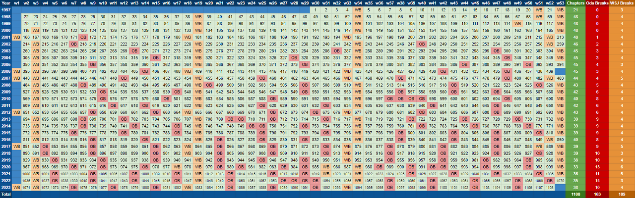 더 이상 고민하지 않고 2019년부터 매년 해왔듯이 2023년 원피스 챕터 출시 일정을 발표합니다 ! 챕터 출시 날짜는 이전 연도의 출시 및 중단을 기반으로 추정되며 공식 데이터가 아닙니다! 항상 그렇듯이 일정에 대한 마지막 순간의 변경 사항은 이 캘린더에 최우선적으로 반영되므로 이 페이지를 북마크하여 항상 최신 정보를 확인할 수 있습니다!